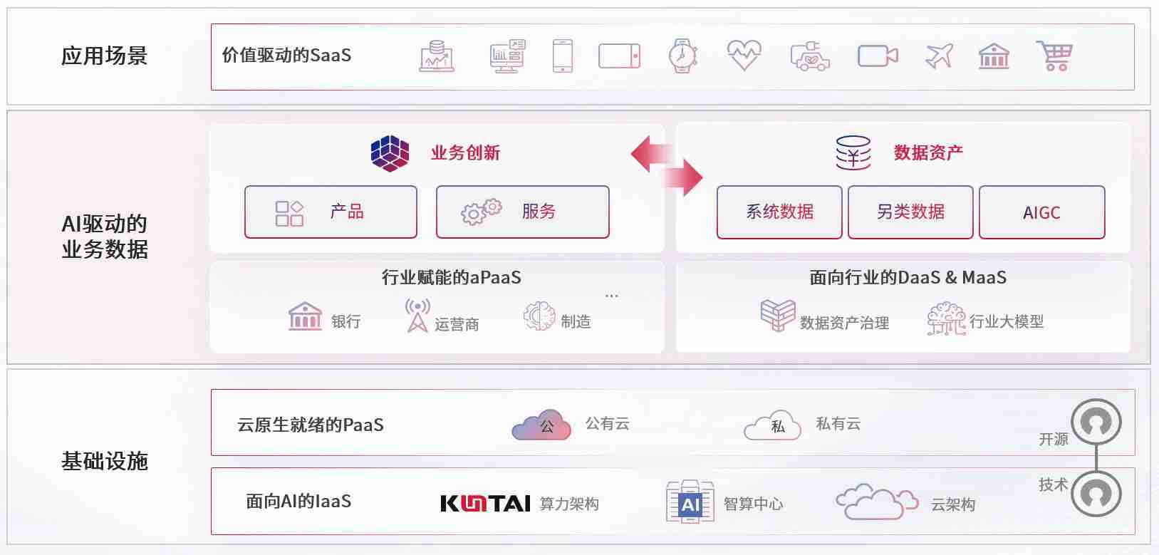 数字时代,,,,围绕企业数字化转型的关键要素,,南宫娱乐数码开创性的提出数云融合战略和技术体系框架,,着力在云原生、、、、数字原生、、、、AI原生和信创产业上架构产品和服务能力,,为处在不同数字化转型阶段的快消零售、、汽车、、金融、、、医疗、、、政企、、、教育、、、运营商等行业客户提供泛在的敏捷IT能力和融合的数据驱动能力,,,构建跨界融合创新的数字业务场景和新业务模式,,助力企业级客户建立面向未来的核心能力和竞争优势,,全面推动社会的数字化、、、智能化转型升级。。