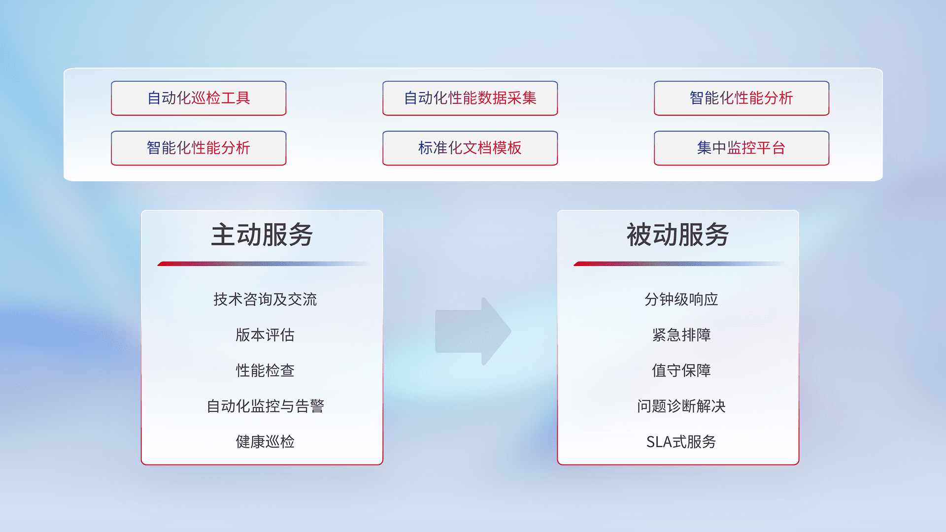 智能化工具和标准化文档,,保障服务质量,,提供主动服务(包含技术咨询、、、、版本评估、、性能检查、、、、自动化监控与告警、、、、健康巡检)和被动服务包含(分钟级响应、、、紧急排障、、、、值守保障、、、、问题诊断解决、、SLA服务)。。